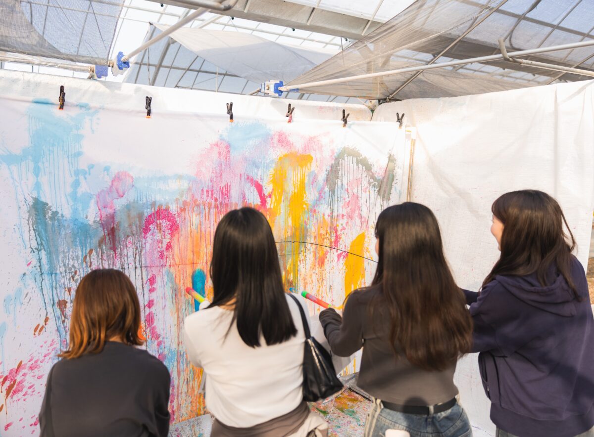 役目を終えた化粧品の中身を様々なモノにアップサイクルする技術を構築している『SminkArt』。そんなSminkArtが開発した『magic water(絵具化する溶液)』を使い、コスメからキラキラした絵具をたっぷりと作ります。作った絵の具を水鉄砲の中へギュっと詰め、それらを白地の布へ思いっきり吹きかければ、カラフルな布アートの完成です。